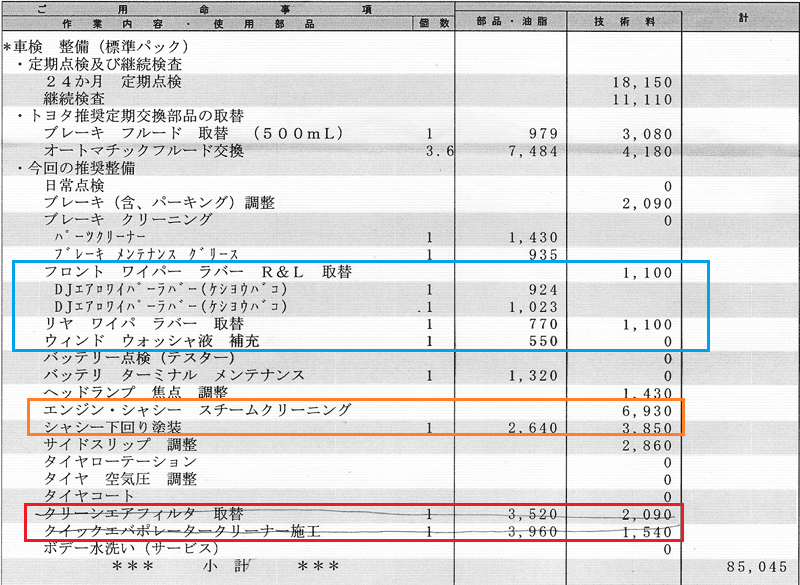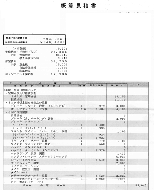 トヨタディーラから提示された車検の概算見積書は